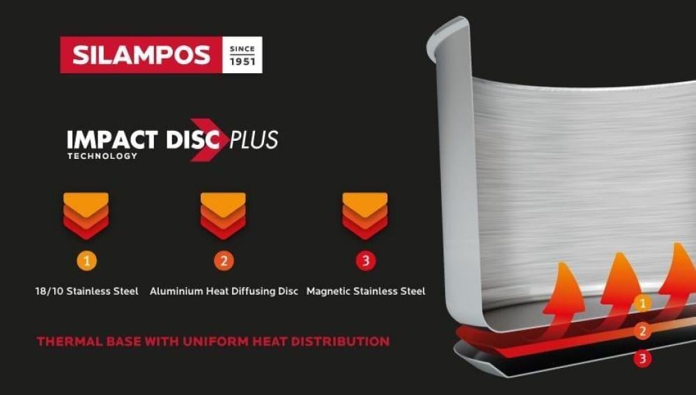 - توزيع مثالي للحرارة في قاعدة القدر مع تقنية Impact Disc Plus Technology.